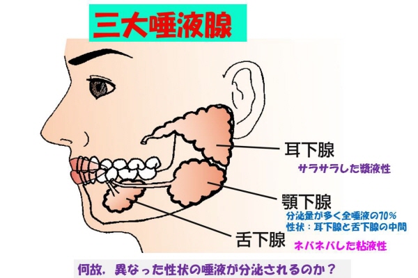 さて唾液は、ヌルヌルの粘液性とサラサラした漿液性に分けることができる。