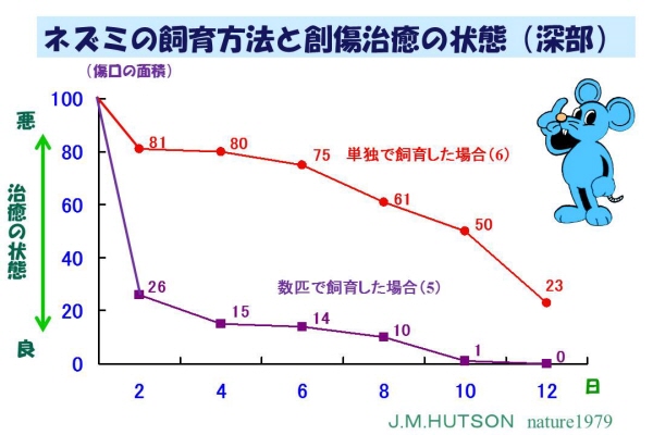 2日後の深部創傷は、単独飼育では20%しか治癒していないのに対し、複数飼育では75%も治癒していた。