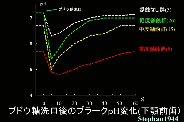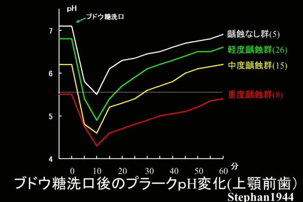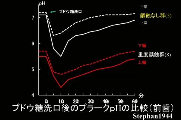 彼は、う蝕の程度により4群に分け、各群の上・下顎永久前歯唇側のプラークpHの変動を調べた。