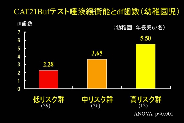 低リスク群(高緩衝能)のdf歯数は2.28歯に対し、高リスク群(低緩衝能)では5.50歯で、約2倍う蝕歯数が多い。