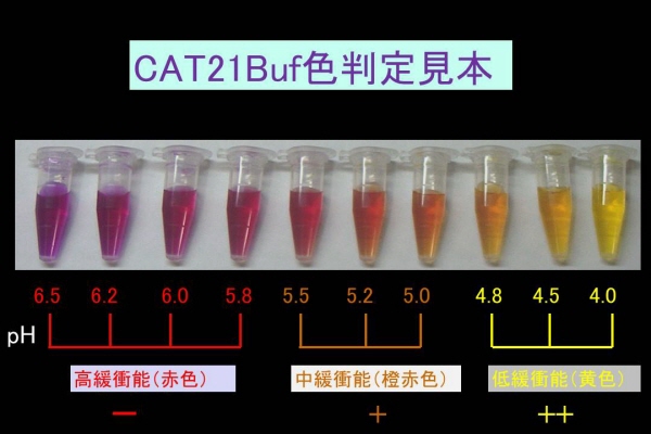 一方、緩衝能が高くなるにつれpHが上昇し橙赤色の中リスク(pH5.0-5.5)から、赤色の低リスク(pH5.8-7.5)に変化する。(注1)