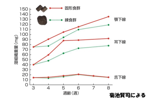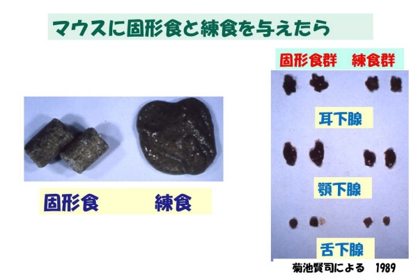 その結果、水分の多いエサを与えられたマウスは、耳下腺・顎下腺・発達が悪かった。
