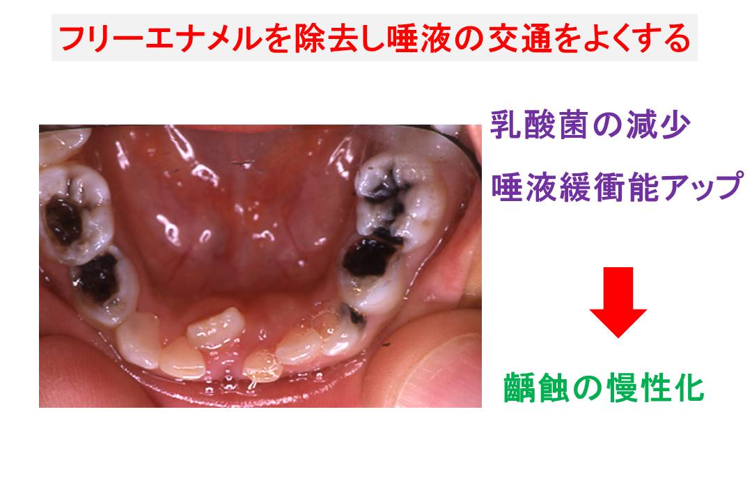 そこで、乳歯う蝕の慢性化を促すため、前処置としてう窩のフリーエナメルを除去し、唾液の交通を良くする。