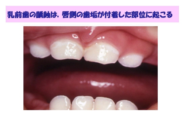 ところで乳前歯のう蝕は、唇側面の歯垢が付着した部分にできる。
