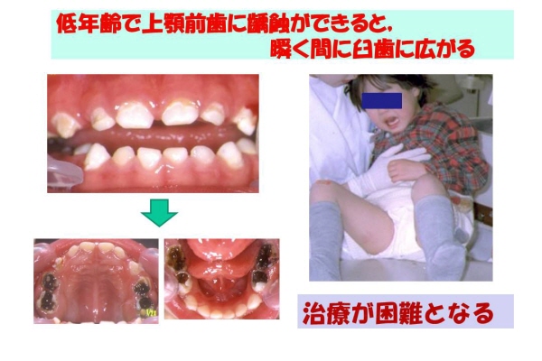 低年齢児では、まず上顎乳前歯に初発する。