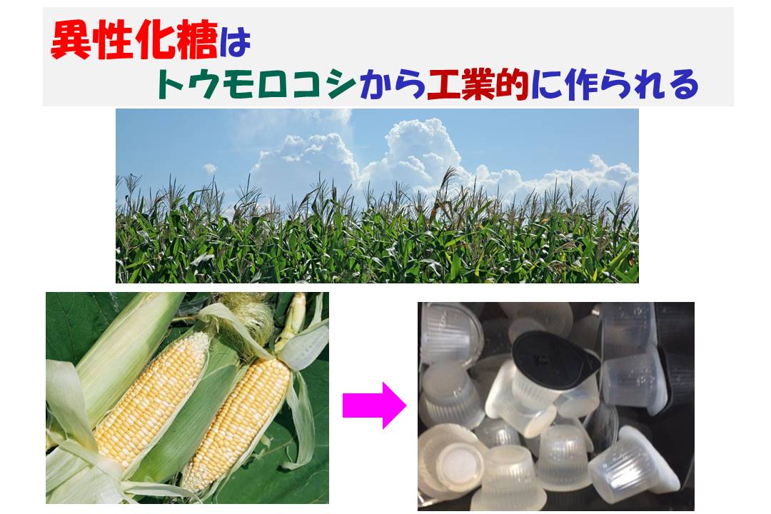 一方、異性化糖はトウモロコシ・ジャガイモ・サツマイモのデンプンを原料とする。
