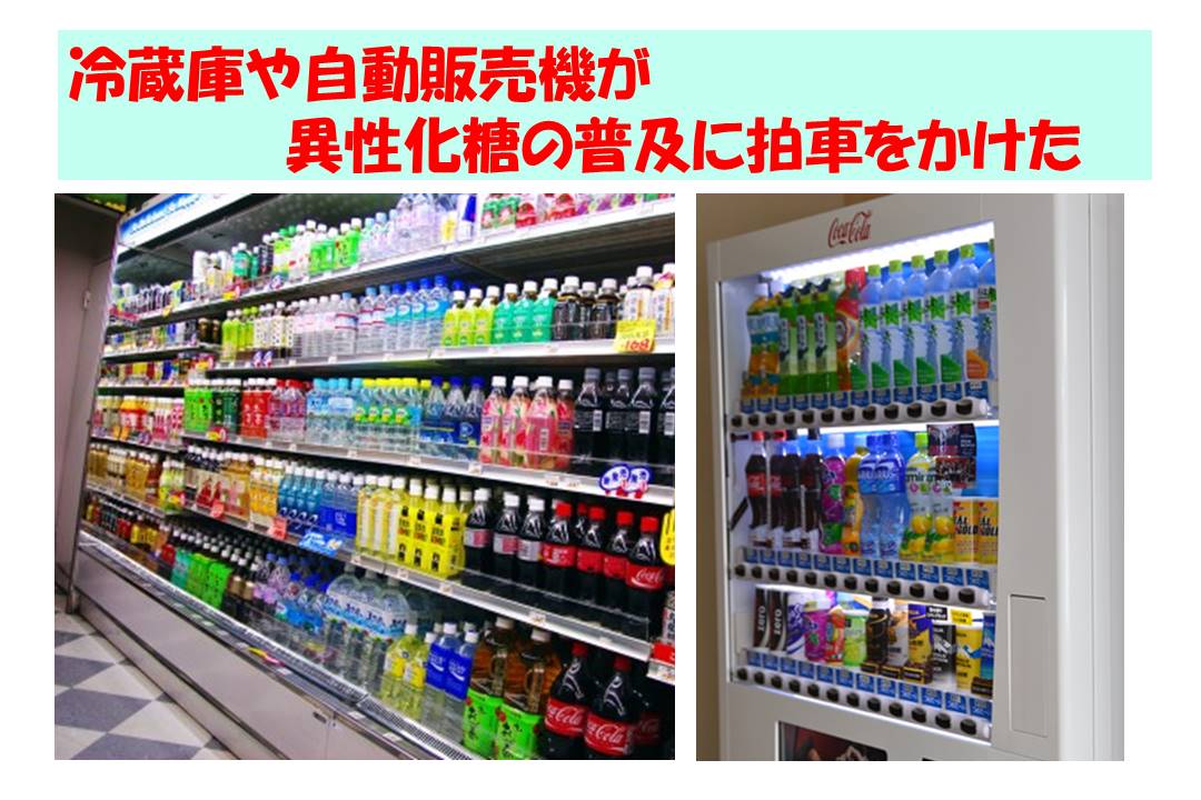 異性化糖は、冷蔵庫や自動販売機の普及により清涼飲料水が飲まれるようになり世界中に広まった。
