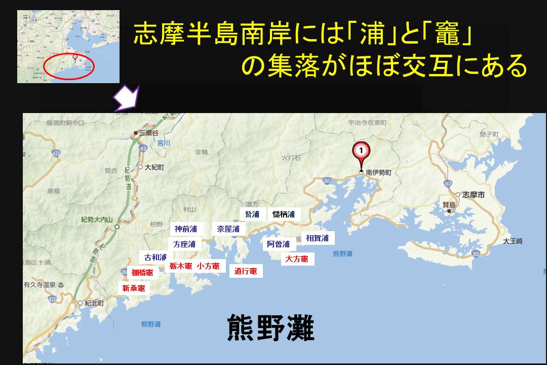そして、その間には古和浦、神前浦、方座浦、奈屋浦、贄(にえ)浦、慥柄(たしから)浦、阿曽浦、相賀浦がある。