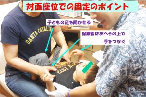 そして、保護者は脇をしめ肘で子どもの足を固定するのだ。