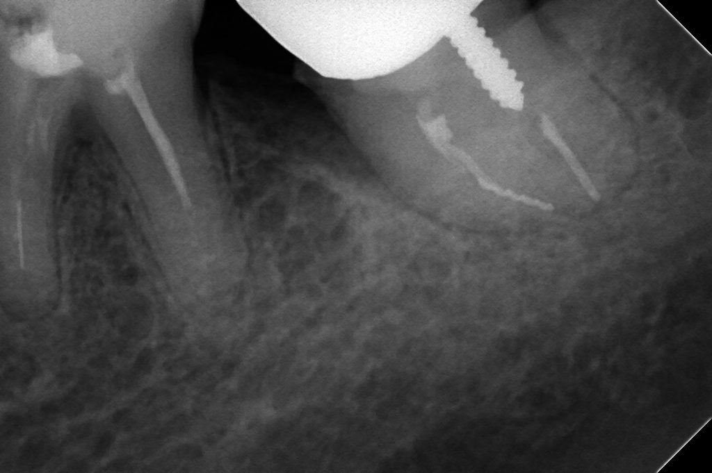 たとえば、下顎左側第二大臼歯の近心根に破折ファイルが認められます。