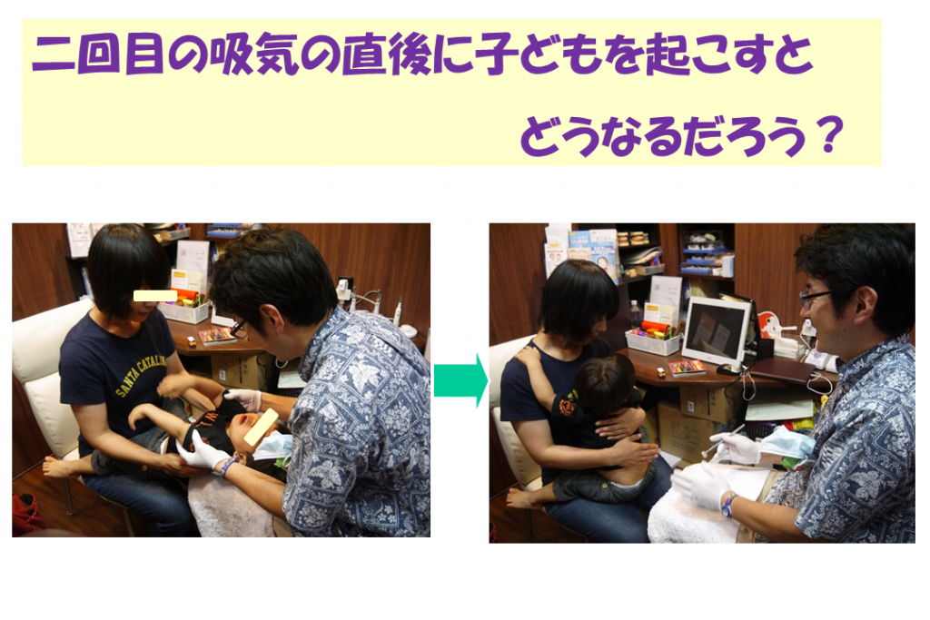 子どもがハア~! ハア~!と2回目の吸気をした瞬間に子どもを起こす。