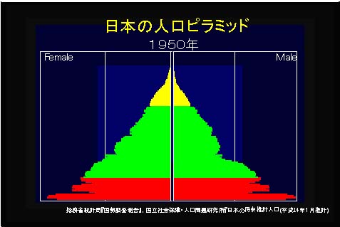 グラフの上端は100歳以上の人口です。1950年の人口構造は、とてもきれいな安定したピラミッドの形をしています。