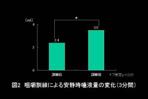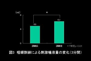 3分間の刺激唾液・安静時唾液ともに1.0ml以上増加している。