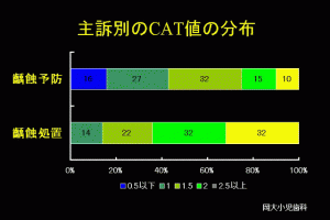 私たちの診療室でも、齲蝕の軽症化が進むとともに、齲蝕予防管理を主訴として来院する患児が増加し、CAT値の分布でも、齲蝕治療の主訴群に対して、齲蝕予防主訴群では、+3が減り、+1が増加している(図3)。