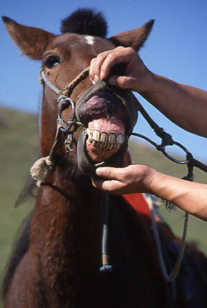 ウマは上下の前歯が、ちょうど毛抜きのように歯の先どおしが当たっている。