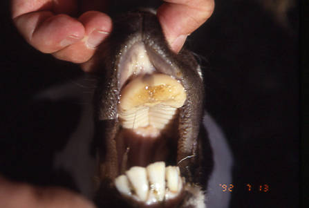 この歯で短い草を抜いて食べる。ところがウシには下の前歯はあるが、上の前歯はない。歯の代わりに歯板(しばん)という硬い骨があるだけだ。