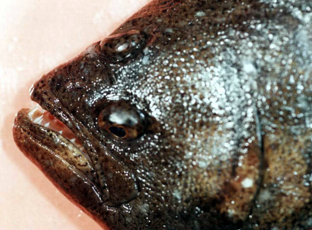 図1 :ヒラメは、肉食のため獰猛な顔をし、口も裂けている。