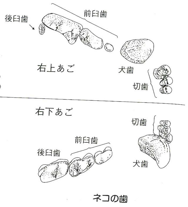 一方、ネコは前歯3/3、犬歯1/1、前臼歯3/2、後臼歯1/1で合計30本。