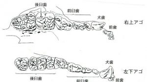 イヌは前歯3/3、犬歯1/1、前臼歯4/4、後臼歯2/3で合計42本。(図1)