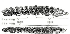 さて、ヒトの歯数は32本、歯式は前歯2/2、犬歯1/1、小臼歯2/2、大臼歯3/3で表される。
