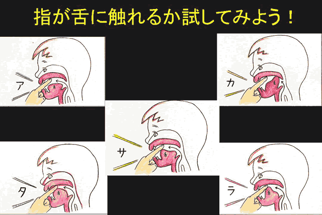 さらに、“タ”と言うと、舌の前半分が、指に強く当たる。