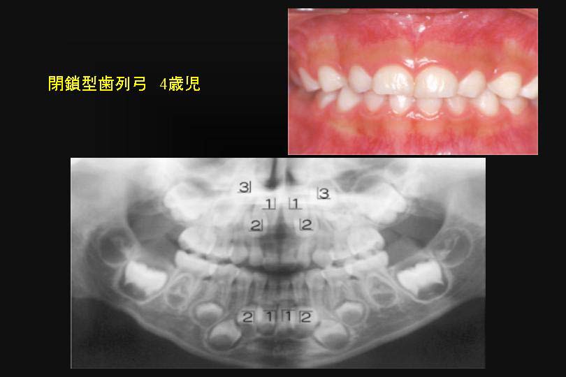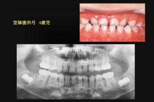 4歳児の乳歯空隙歯列弓のパノラマレントゲン撮影を行うと、下顎の永久4前歯は顎骨内で並列になっており、