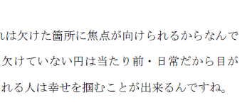 足りている所に目を向け、当たり前ですが、感謝し、ありがとう、と思える事で、人の輪は波及していくと思います。
