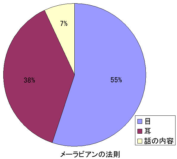 テーマに持ってきた「人は見た目が9割」竹内一郎著の本ですが、これは大げさでも何でもないのですね。こんなデータがあります。メーラビアンの法則といいます。(添付資料参照)人に何かを伝える時には、言葉や話の内容で理解してもらえるのはたったの7%しかないのです。後は目や耳から入る情報、つまりジェスチャーや声の調子で、何を言いたいか、相手には伝わっているのです。例えば、カップルの会話です。「お前なんか大嫌い」「私も嫌い」となんだか危ない会話。ただ、手は恋人つなぎ、声は優しい調子、目は見つめ合って笑っている。これは?そうですよね。心は「スキ」っと発して、相手も「うれしい」と受け止めて、「私もあなたのことスキッ」と返していますよね。日常でも、「はい」とお返事はいいけれど、「あいつはわかってない」とお叱りを受けるのは、この辺りで、相手に見抜かれているのですね。気をつけたいものですね・・・。