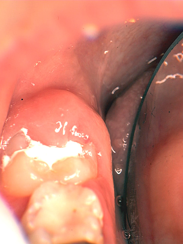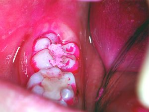 このようなメカニズムでタンニンは、“抗菌作用”・“抗酸化作用”を持っていたのです。ところでタンニンの抗菌性とフッ化物の歯質強化作用を期待して作られたのがHY剤含有のセメントです。さて筆者は、HY剤配合セメントをう蝕感受性の高い萌出途上歯のテンポラリー・シーラントとして利用してきました。(図1)このセメントについて最近、面白いことに気がつきました。それは、セメントの上には歯垢が付きにくいのです(図2)。そこで実験を行ってみました。