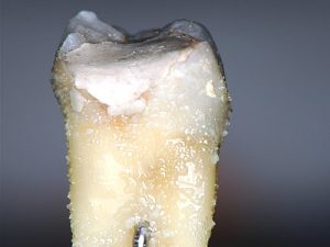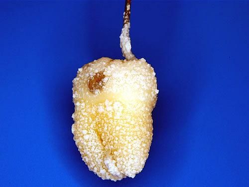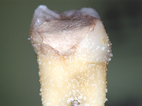 蔗糖20%の培地を作り、HY剤配合セメントで仮封した永久歯を入れ37℃で培養しました。2日後のコントロール群では、多量の歯垢が付着しています。