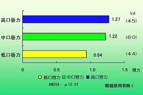 一連の研究の中で、小学校5・6年生における口唇閉鎖力と視力との関係について調べてみると、口唇閉鎖力は視力と関係するという結果が得られた。口唇閉鎖力の強い1/3の児童の平均視力は1.27に対し、弱い1/3では0.94と、その差は0.3もあった。(図1)
