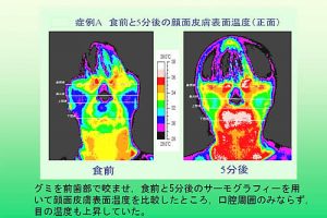 筆者が、10年ほど前に行った研究。グミを5分間前歯で噛み、サーモグラフィーで顔面の皮膚表面温度を測った。筋の活動量や血液循環が良くなれば当然温度は上昇する。その結果、噛んだ後では、咬筋・側頭筋などの閉口筋相当部のみならず、開口筋である舌骨筋群が存在する頸部でも上昇していた。さらには、口唇周囲でも上昇が認められた。なるほど!!!噛むことは、咀嚼筋のみが働いているのではない。食物の取り込みや、食塊の落下防止のために口唇周囲筋も働いていたのだ。だから口の周囲の温度も上昇したのか・・・。(図2)