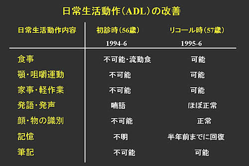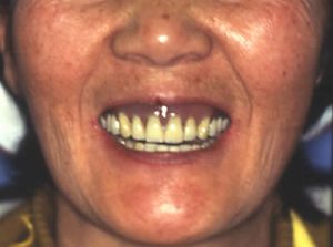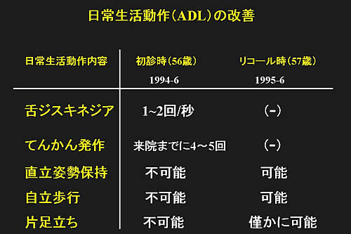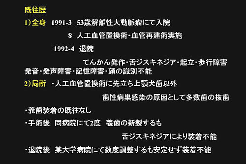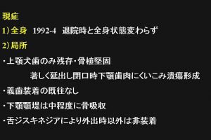 手術は成功したが、意識はあるものの終日朦朧とした状態であり、起立障害や発声障害、記憶障害などがあった。義歯を作製したが、舌ジスキネジアのため、安定せず装着不可能な状態であった。(図1)