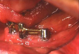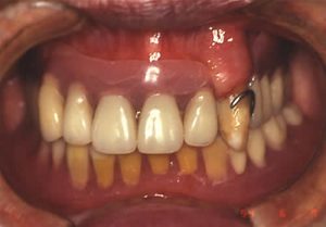 しかし、紹介の患者さんであったため、下顎前歯部にインプラントをいれることにした。そして、その上に義歯を装着した。(図5,6)
