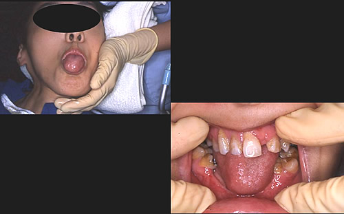 この児は以前、舌が突出していなかった。ところが肺炎で呼吸停止をきたし、救命処置で気管内送管を行った。その時、下顎前歯が脱臼した。一命は食い止めたものの、以後食べさせようとしても反射的に舌が出るので食べさせることができない。