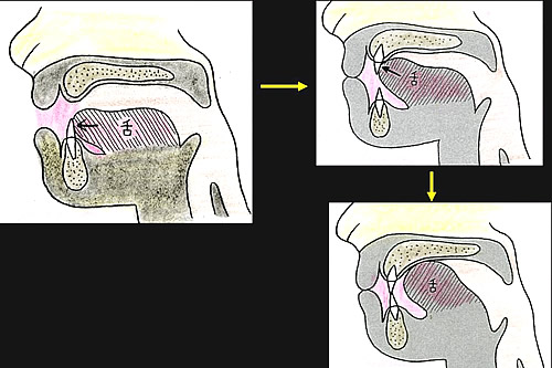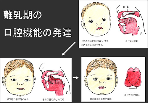 舌は、離乳初期には前後運動する。そして中期には上下運動をして、離乳後期には左右運動となる。(図3)