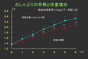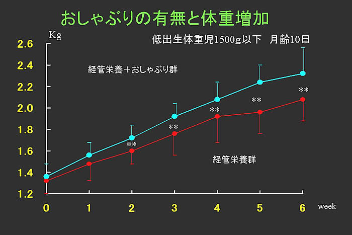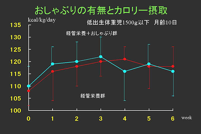 面白い研究がある。出生体重1500g以下の経管栄養児に、おしゃぶりを与えると、体重増加が著しかった。(図1,2)